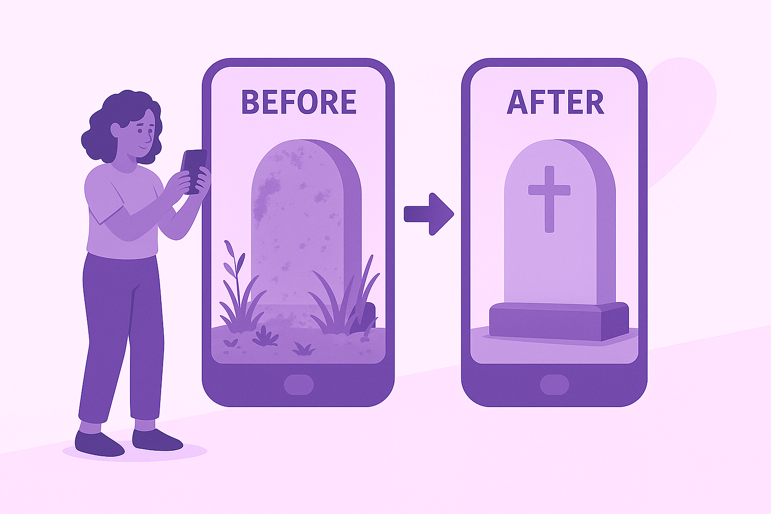 Pour chaque intervention, je prends le temps de réaliser une photo avant et après le nettoyage de la sépulture. Cela permet à chaque client de voir concrètement le soin apporté et la différence visible après mon passage.